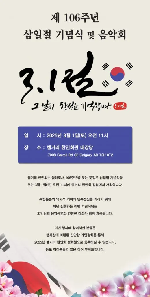 • 장소: 캘거리 한인회관 (7008 Farrell Road SE, Calgary)